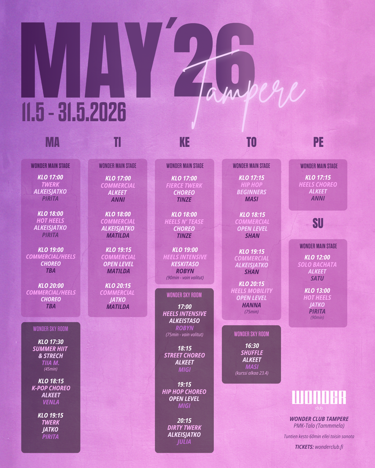 💜 Huom! Touko- ja kesäkuun 3 viikon kurssit sekä kesäkauden sarjakortit myydään erikseen, eikä kevätkauden sarjakortteja voi käyttää näillä tunneilla.